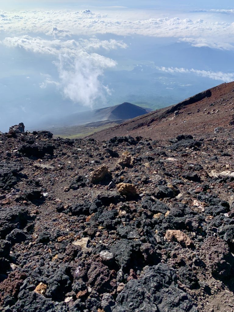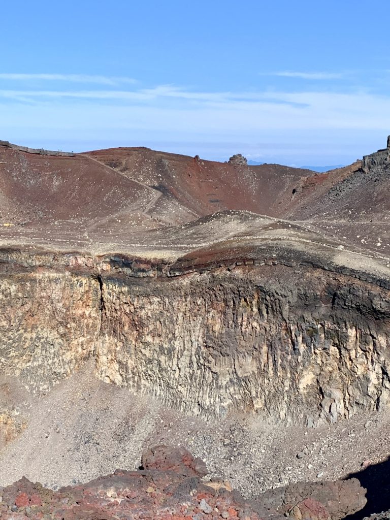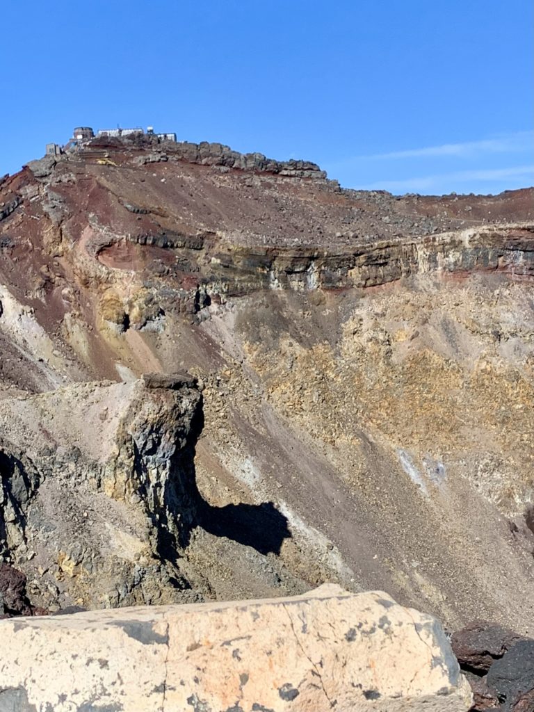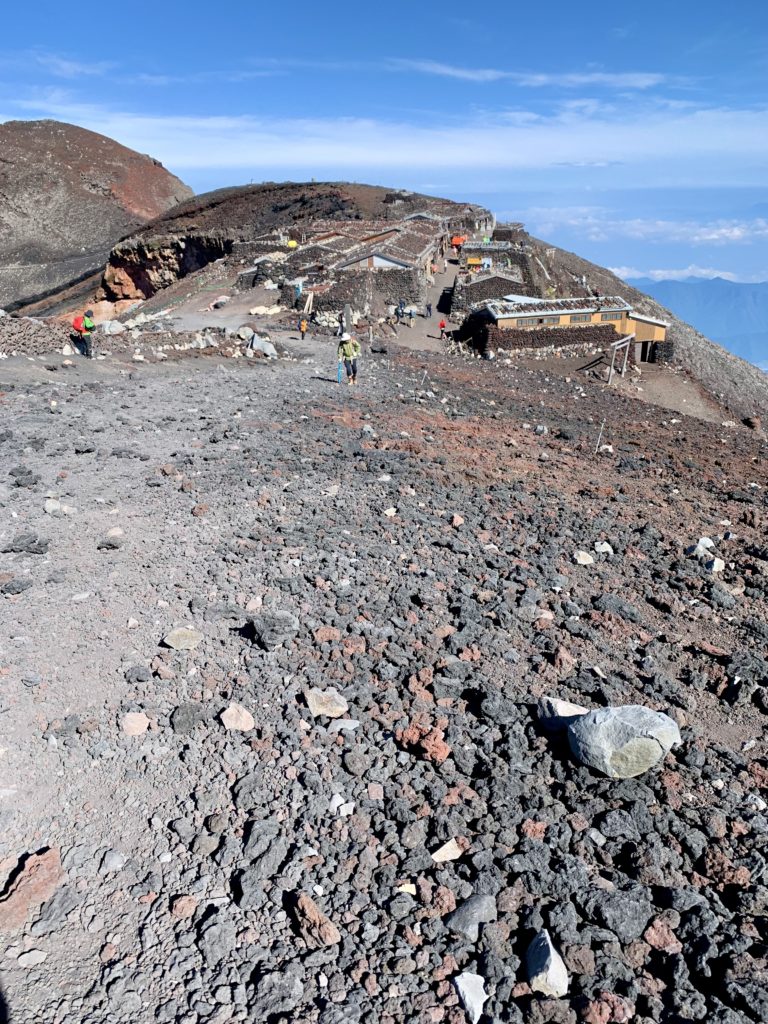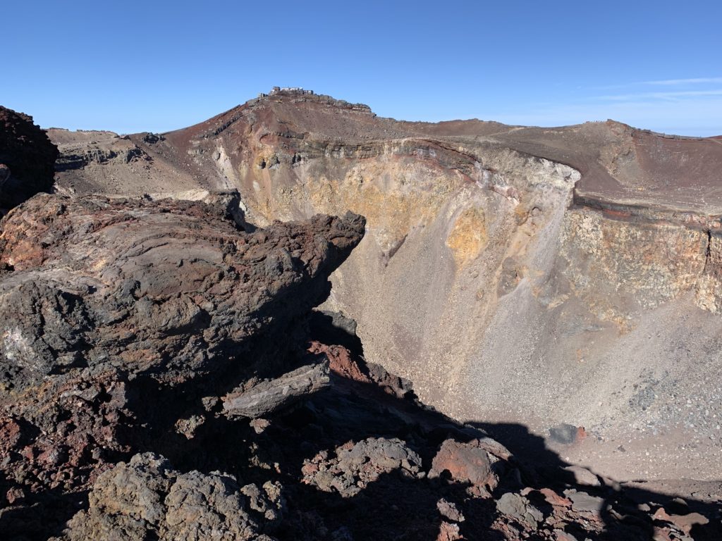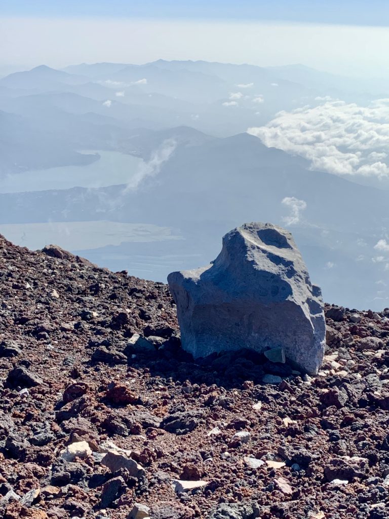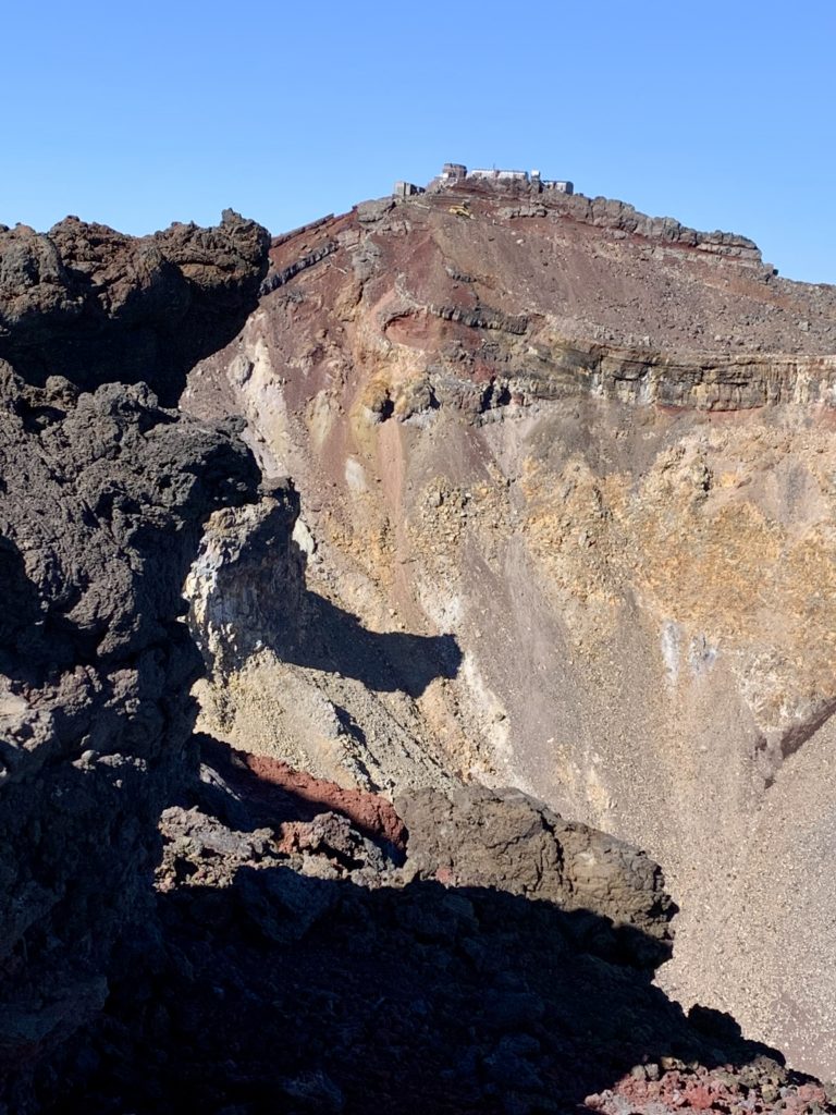 De l’autre côté du cratère, le point le plus haut du mont Fuji: KengamineLe versant noir tout lisse en apparence est une n des cratères du volcan (éruption relativement récente datant de la période Edo?)Au fond à gauche, le point le plus haut du mont Fuji: KengamineSommet (10e étape)