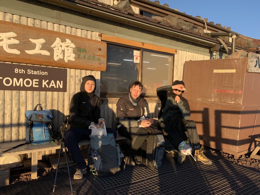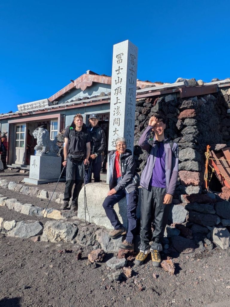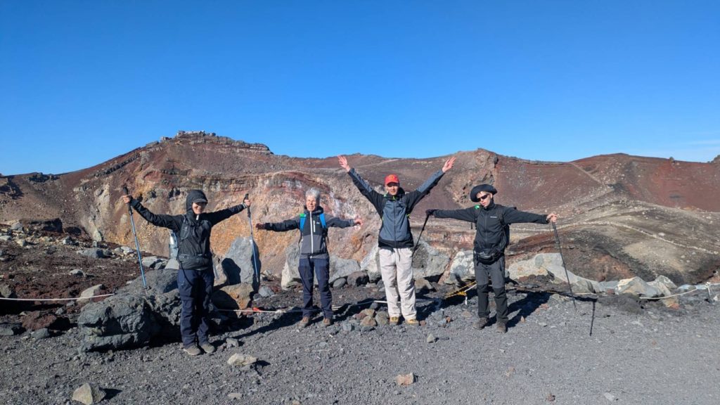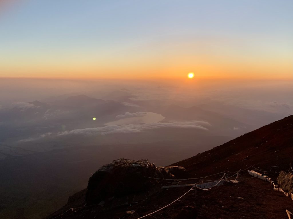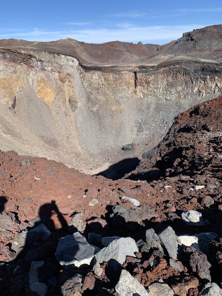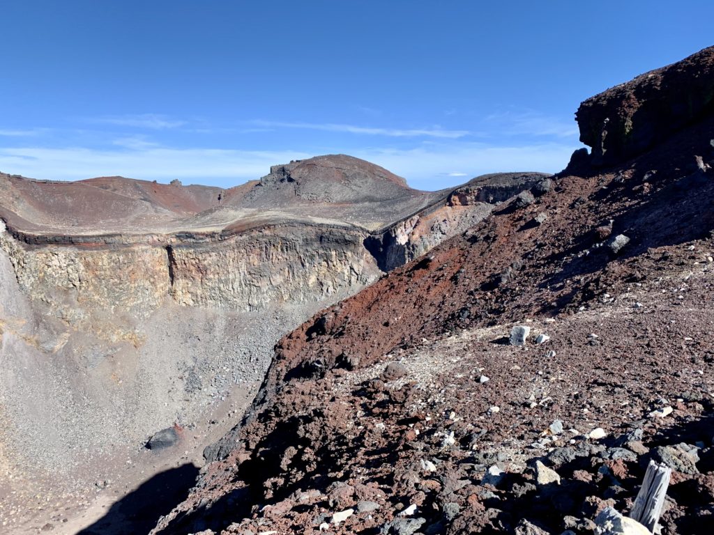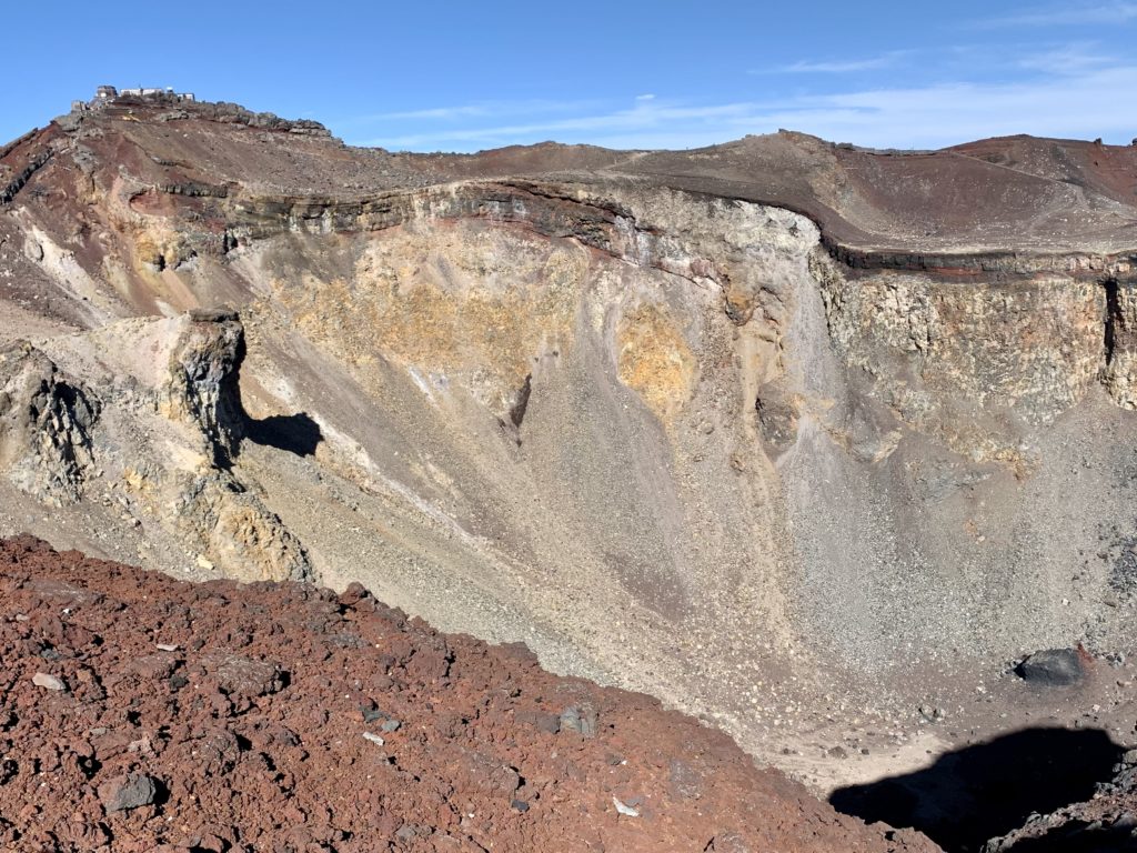 De l’autre côté du cratère, le point le plus haut du mont Fuji: KengamineLe versant noir tout lisse en apparence est une n des cratères du volcan (éruption relativement récente datant de la période Edo?)Au fond à gauche, le point le plus haut du mont Fuji: KengamineSommet (10e étape)